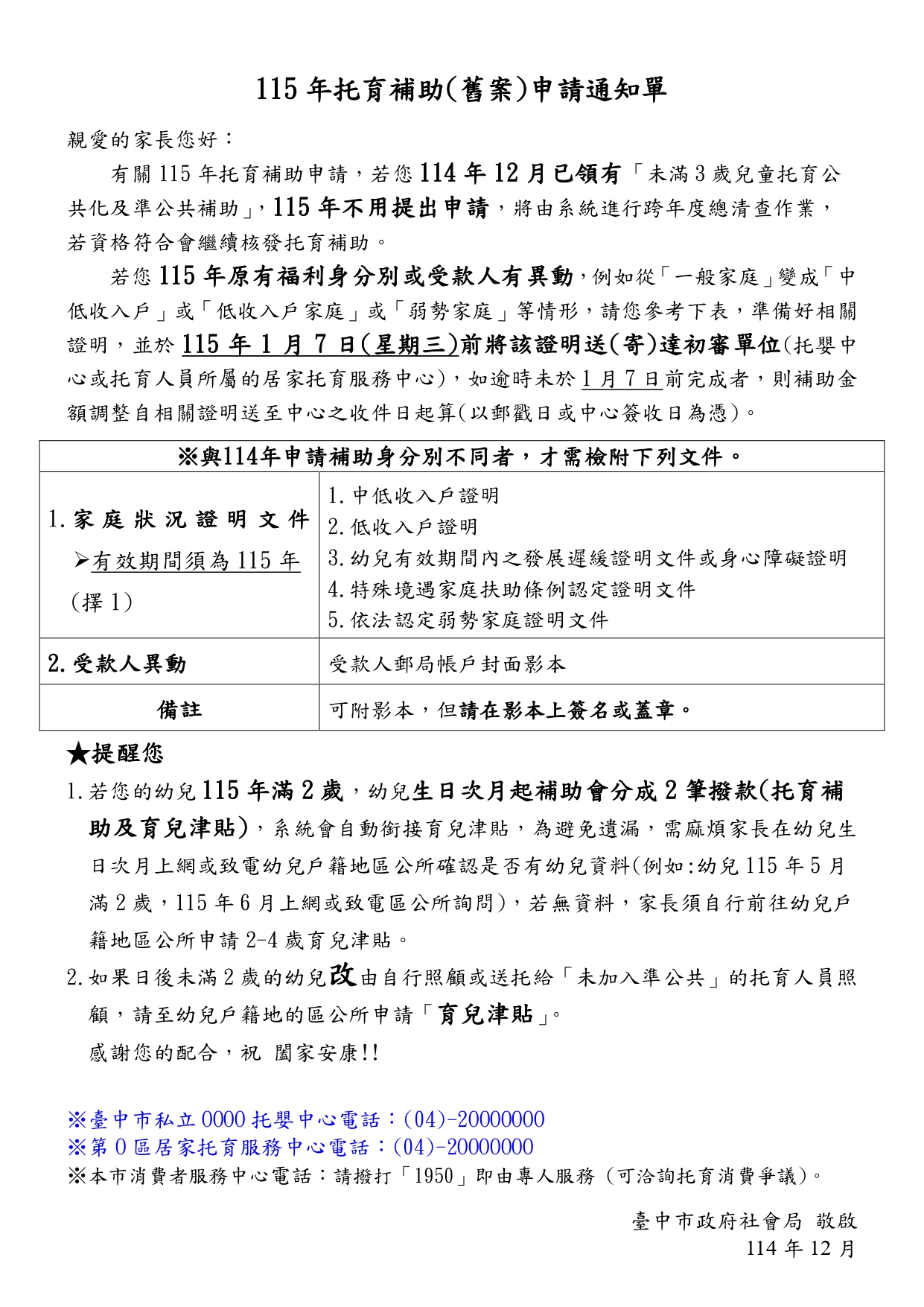 (重要)修訂「臺中市居家在宅/居家到宅托育服務契約範例」113年9月24日起《建議》適用