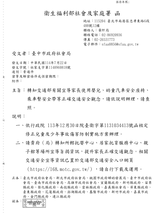 【宣導】家長使用嬰兒、幼童汽車安全座椅、 乘車繫安全帶等正確交通安全觀念