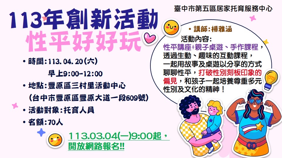 性平講座+親子桌遊、手作課程,透過生動、趣味的互動課程,一起用故事及桌遊以分享的方式聊聊性平,打破性別刻板印象的偏見,和孩子一起培養尊重多元性別及文化的精神!