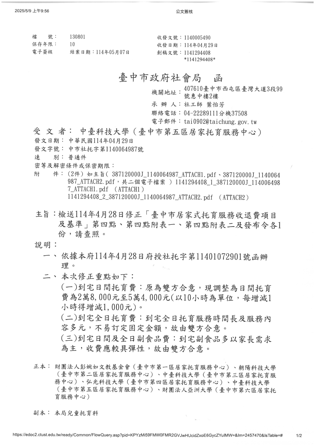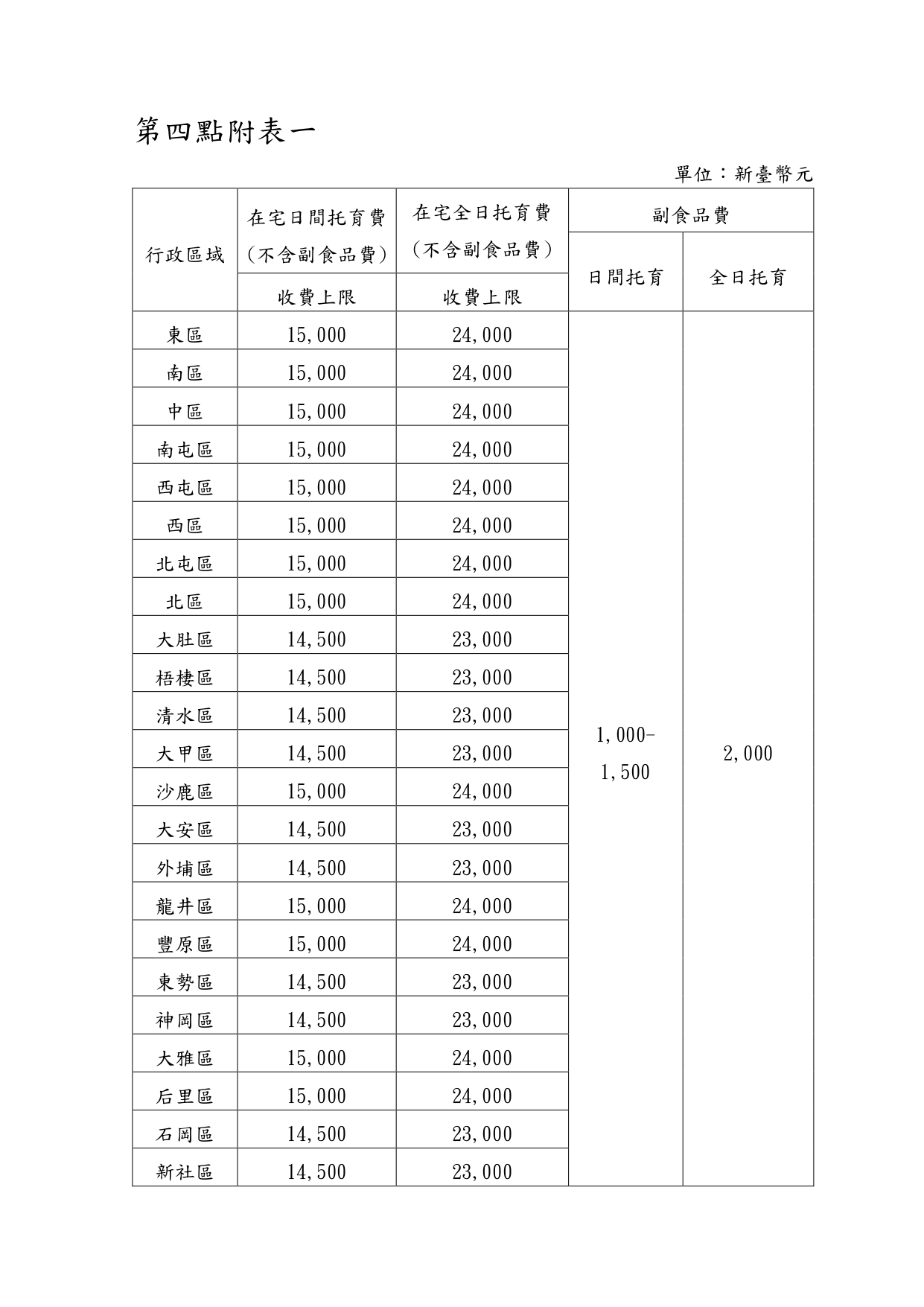 臺中市政府修正[臺中市居家式托育服務收退費項目及基準]