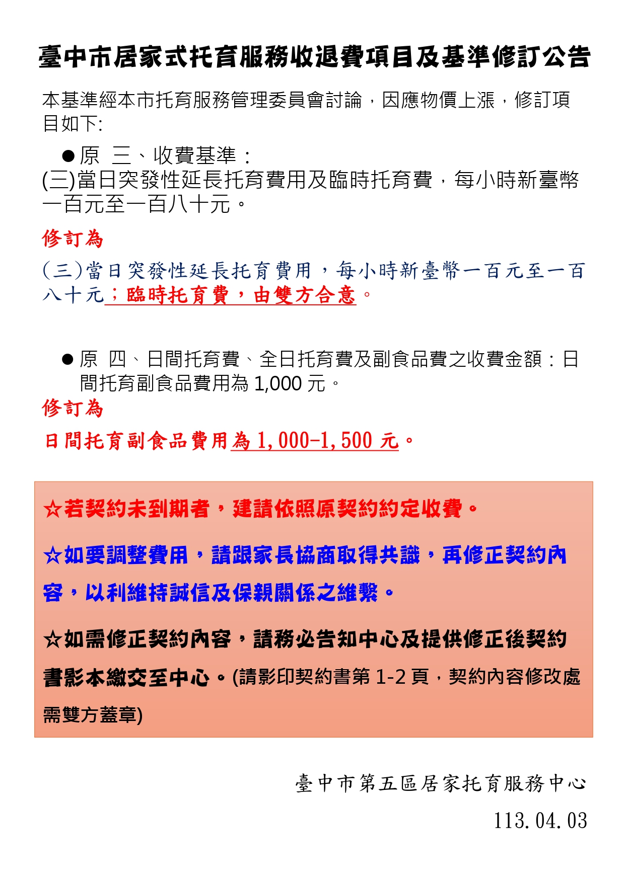 ★【重要】修正臺中市居家式托育服務收退費項目及基準