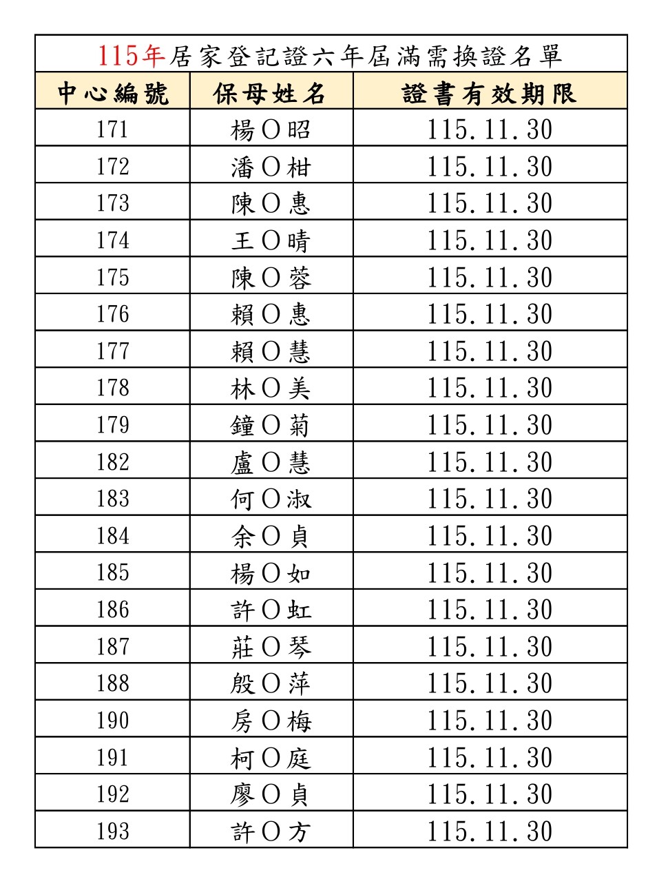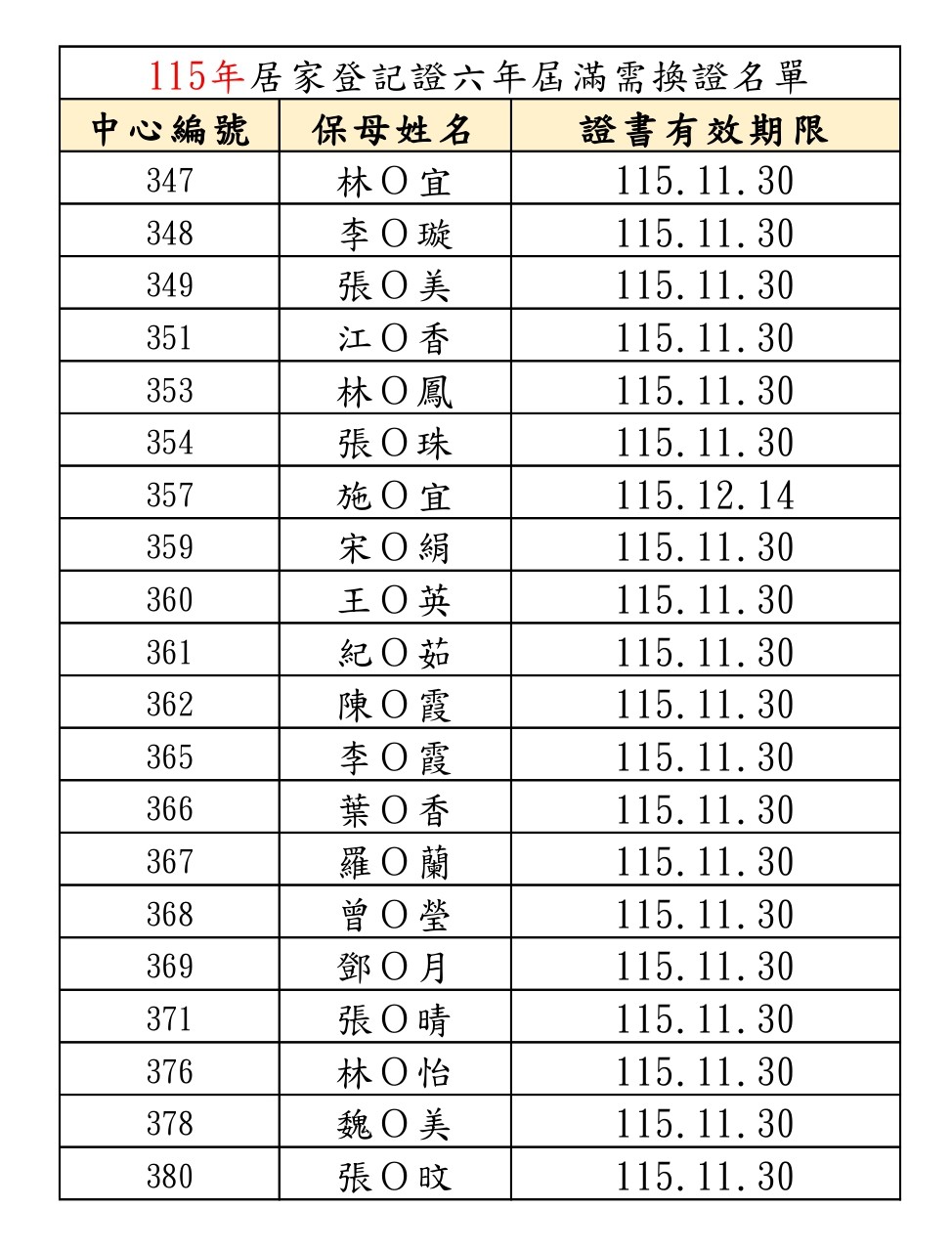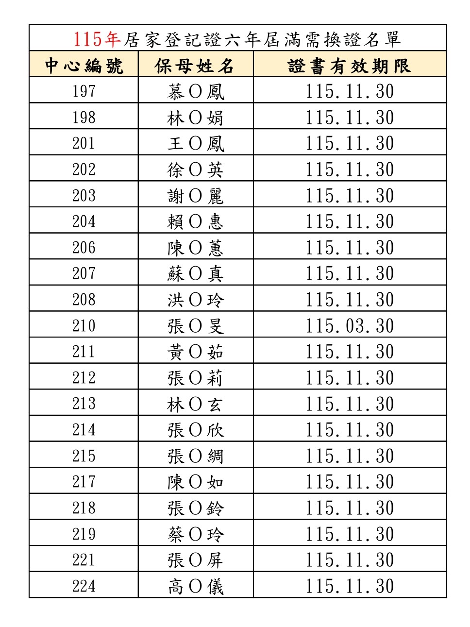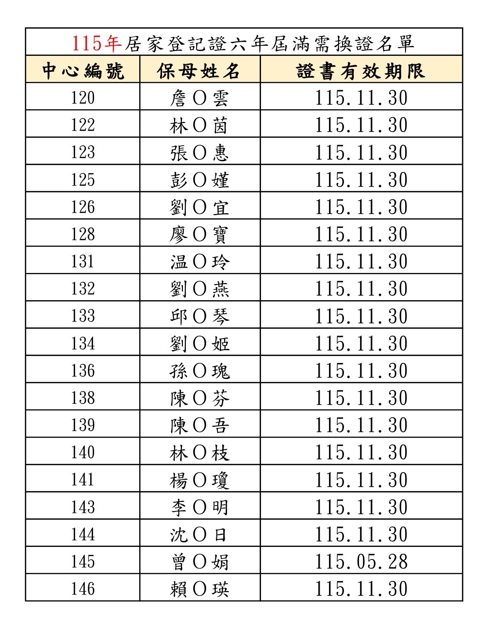 115年度登記證六年屆滿需換證名單如下表(共計20頁)