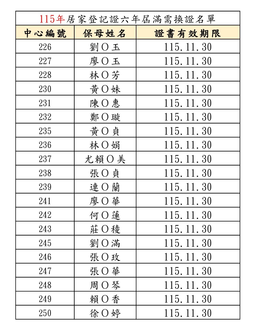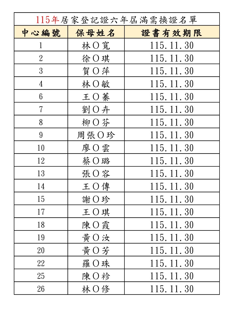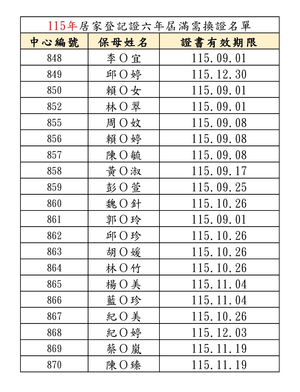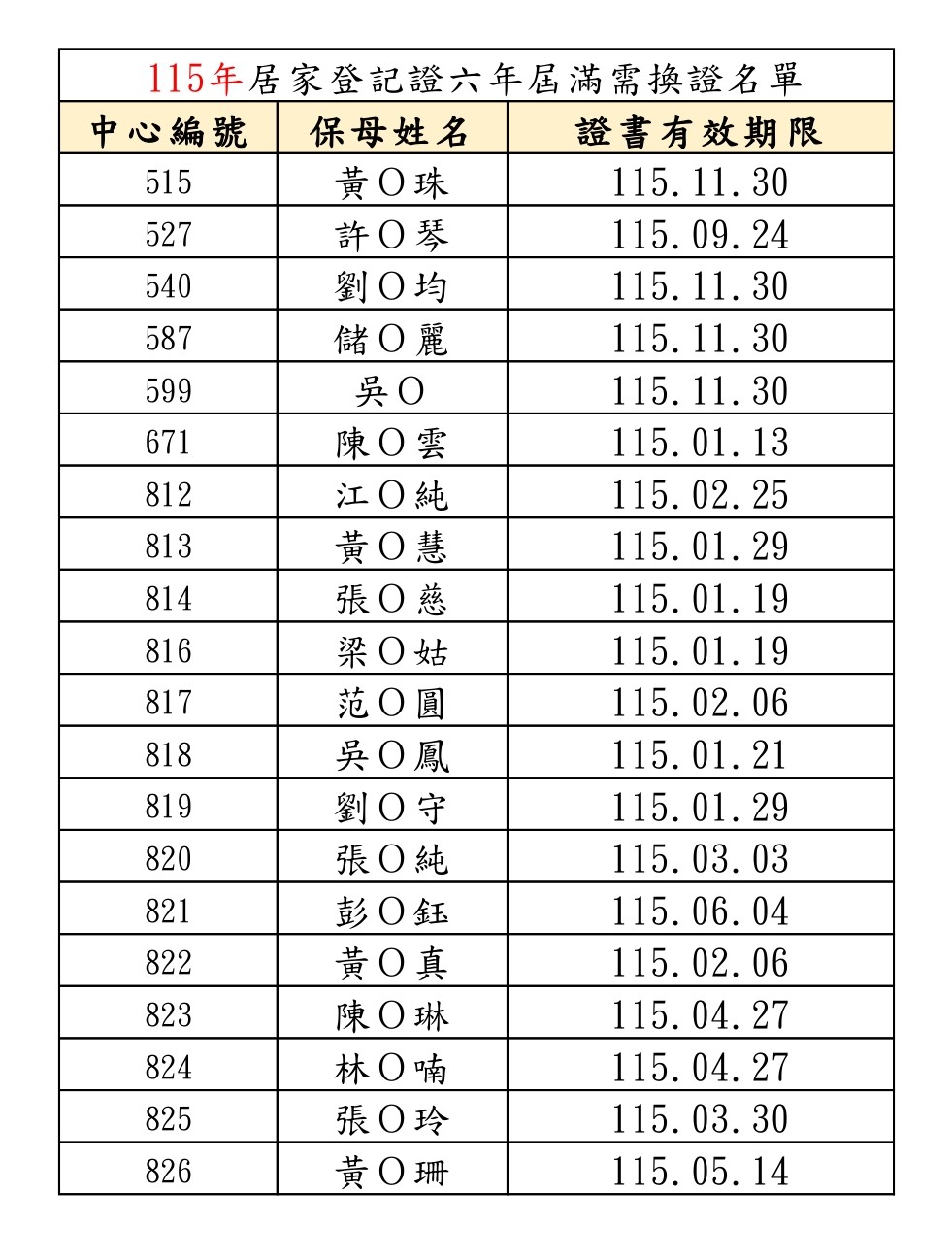 115年度登記證六年屆滿需換證名單如下表(共計20頁)