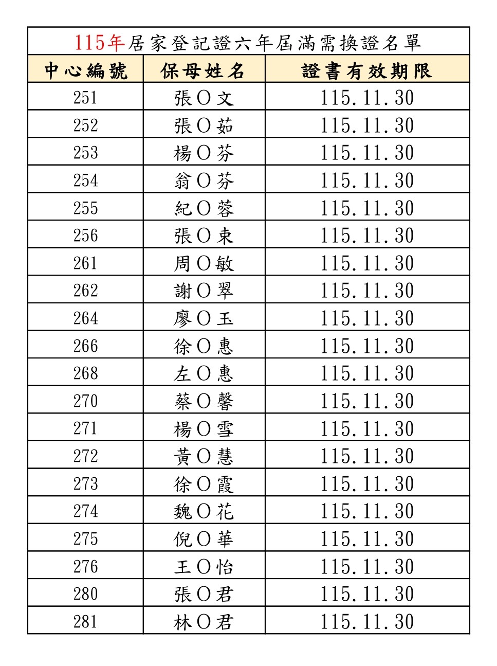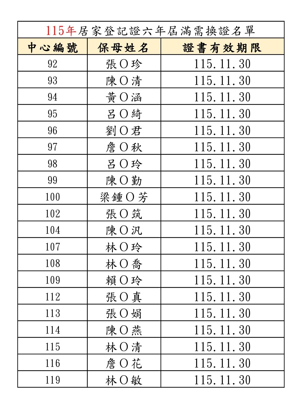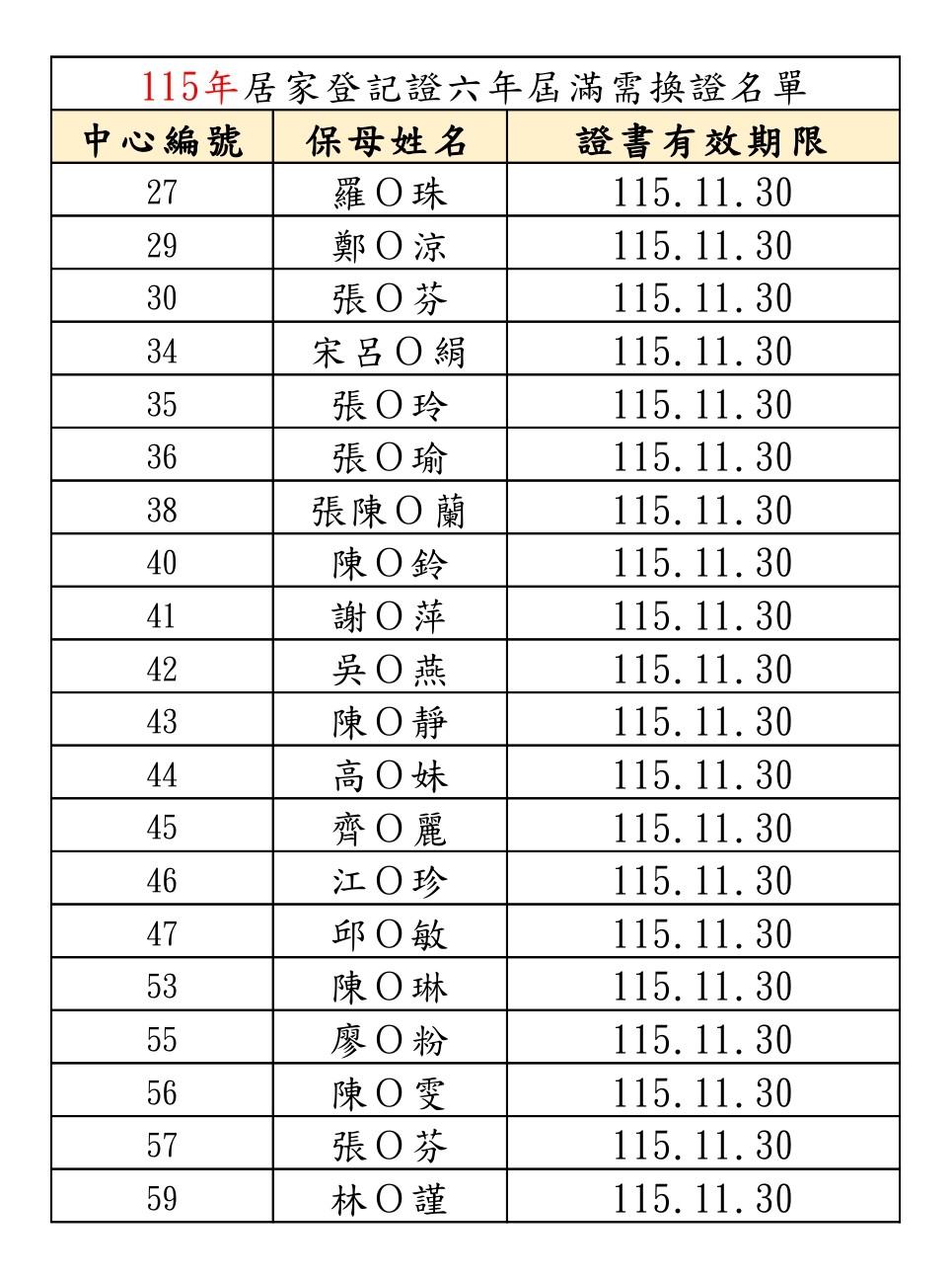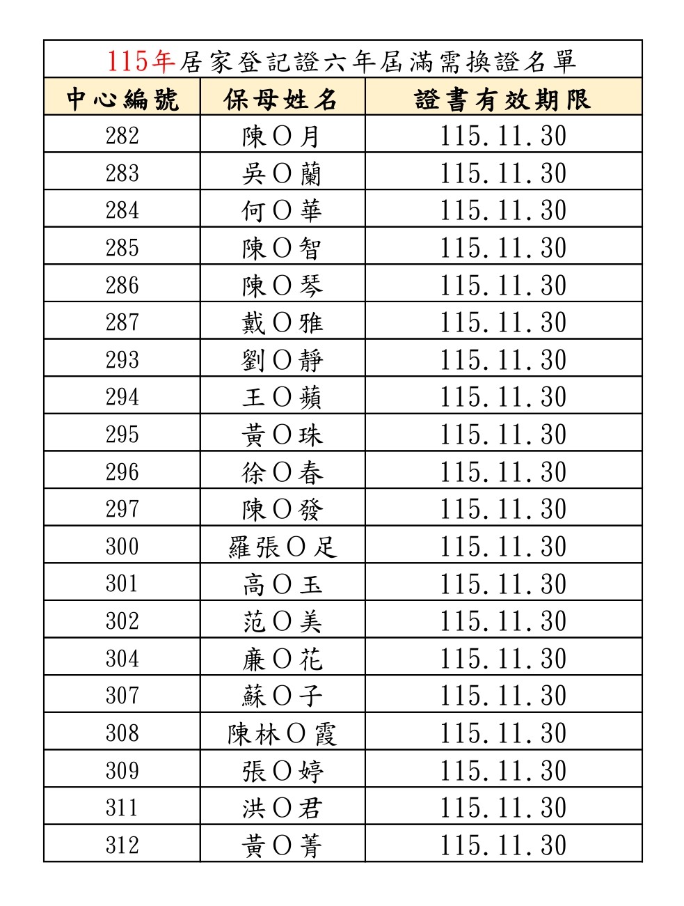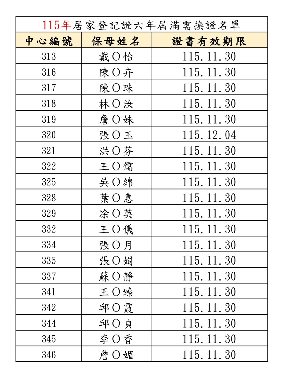 115年度登記證六年屆滿需換證名單如下表(共計20頁)