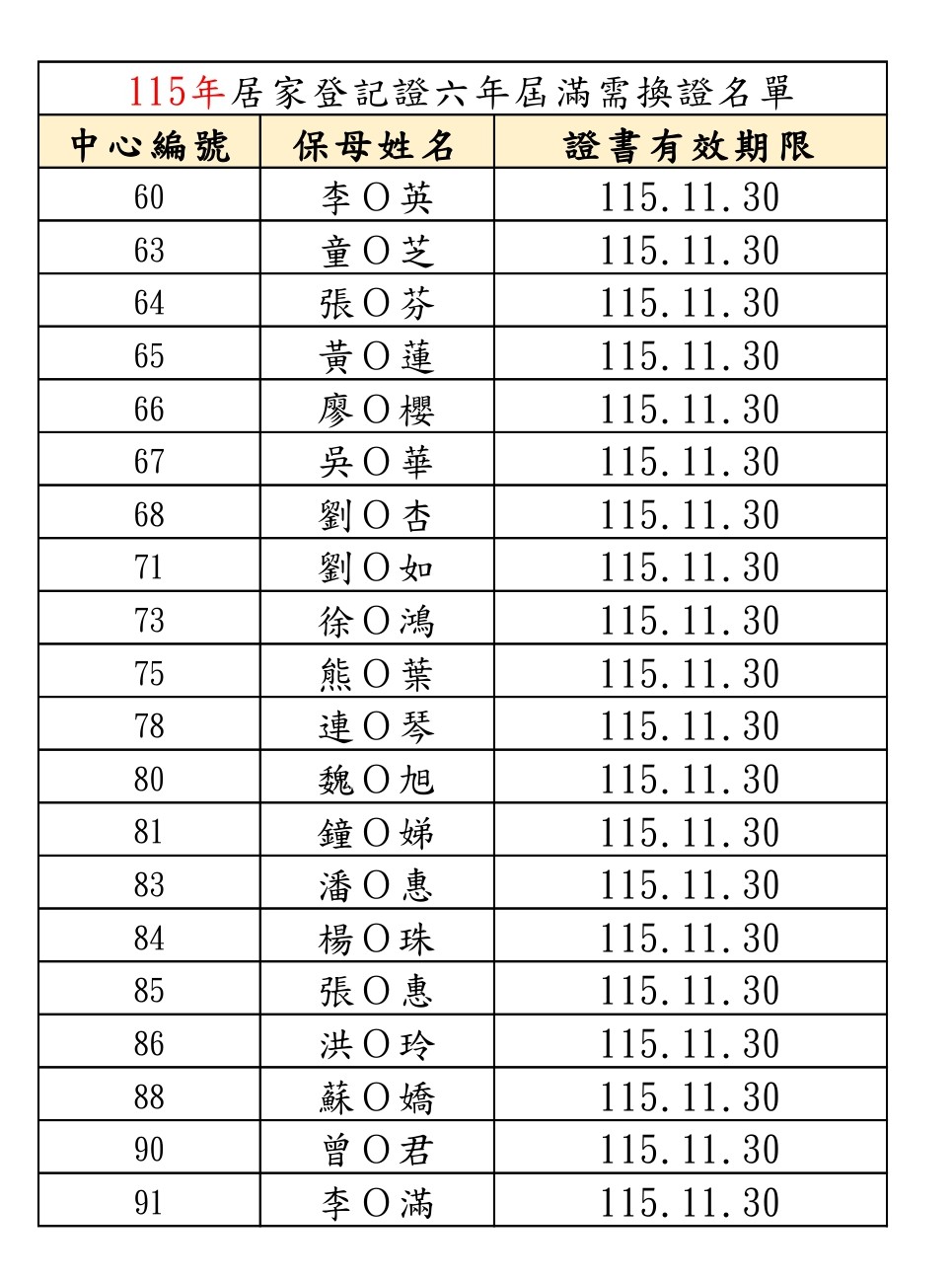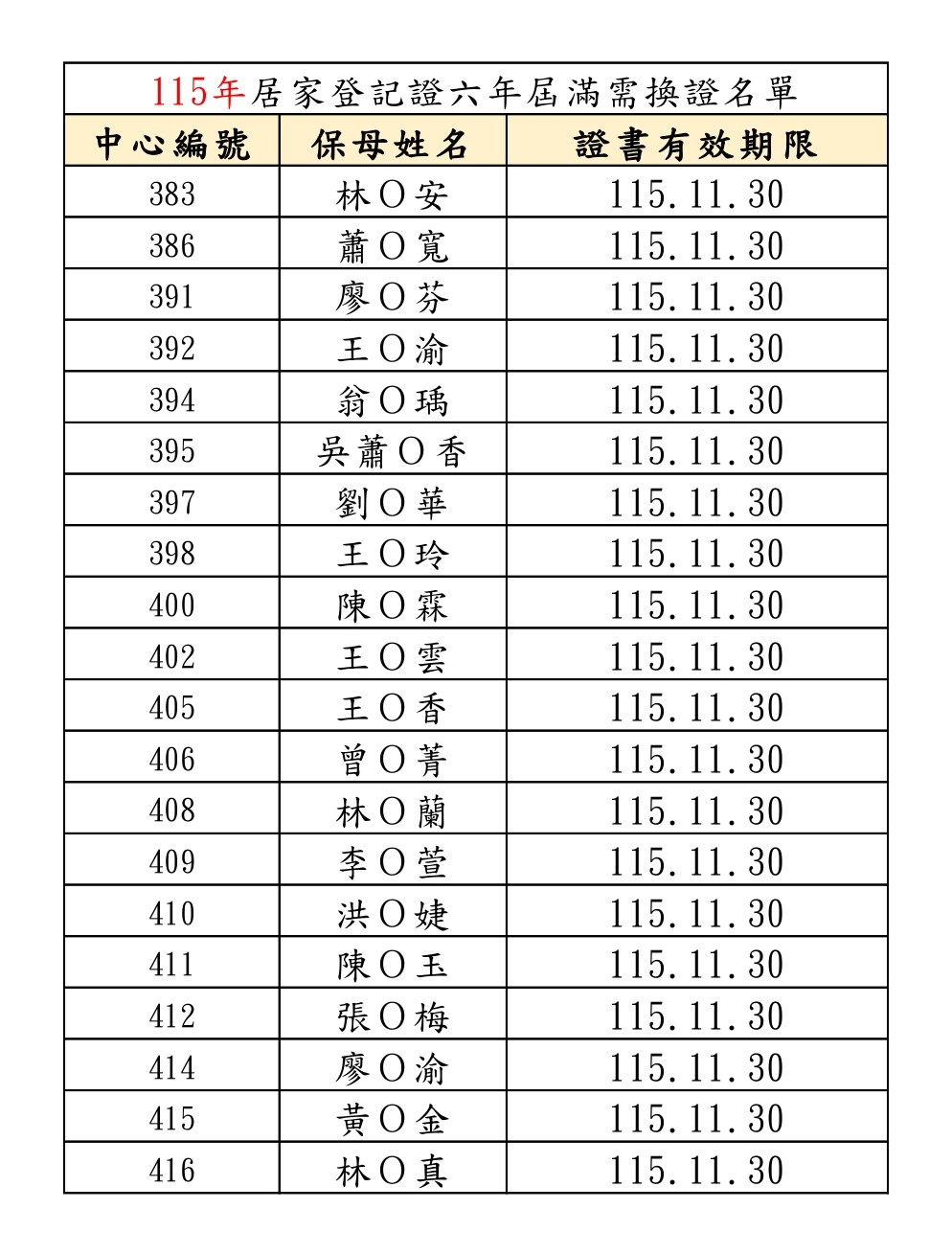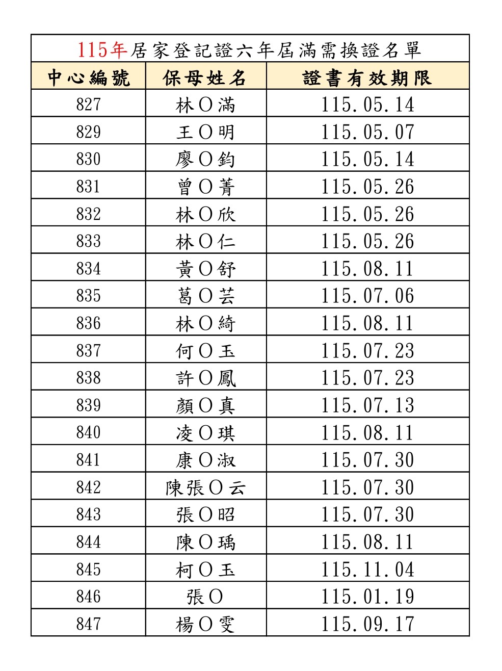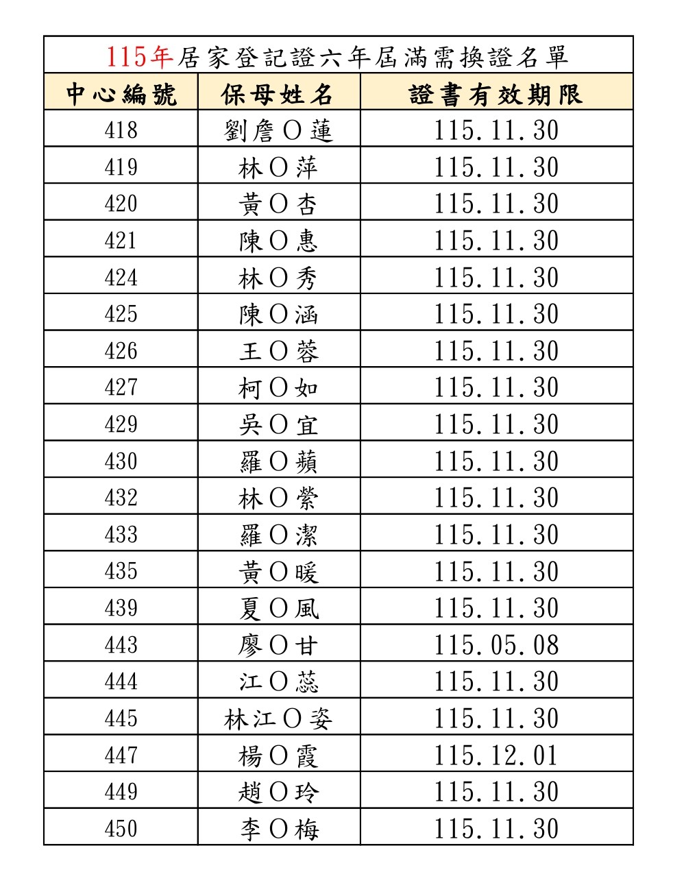 115年度登記證六年屆滿需換證名單如下表(共計20頁)