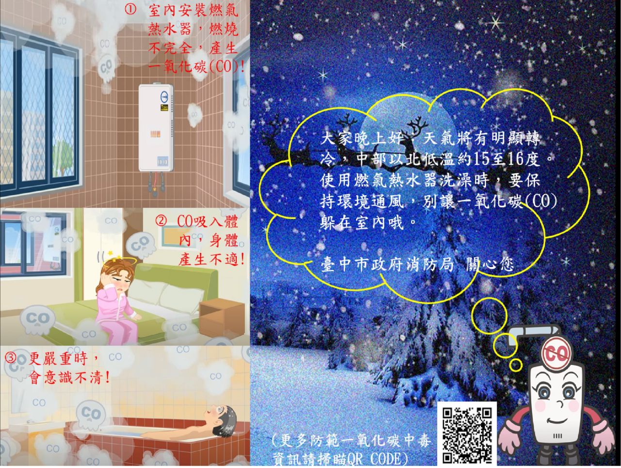 使用燃氣熱水器勿因天冷而門窗緊閉,以免通風不良造成一氧化碳中毒!