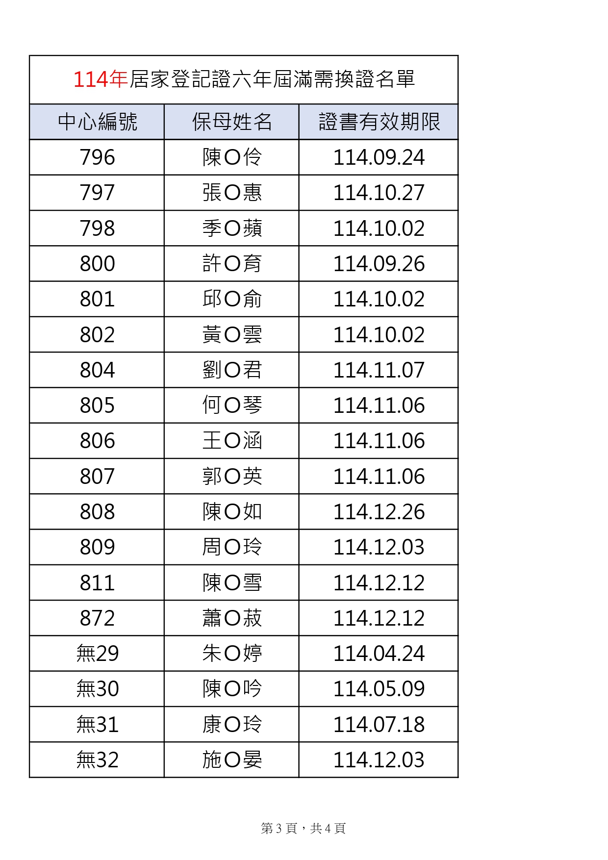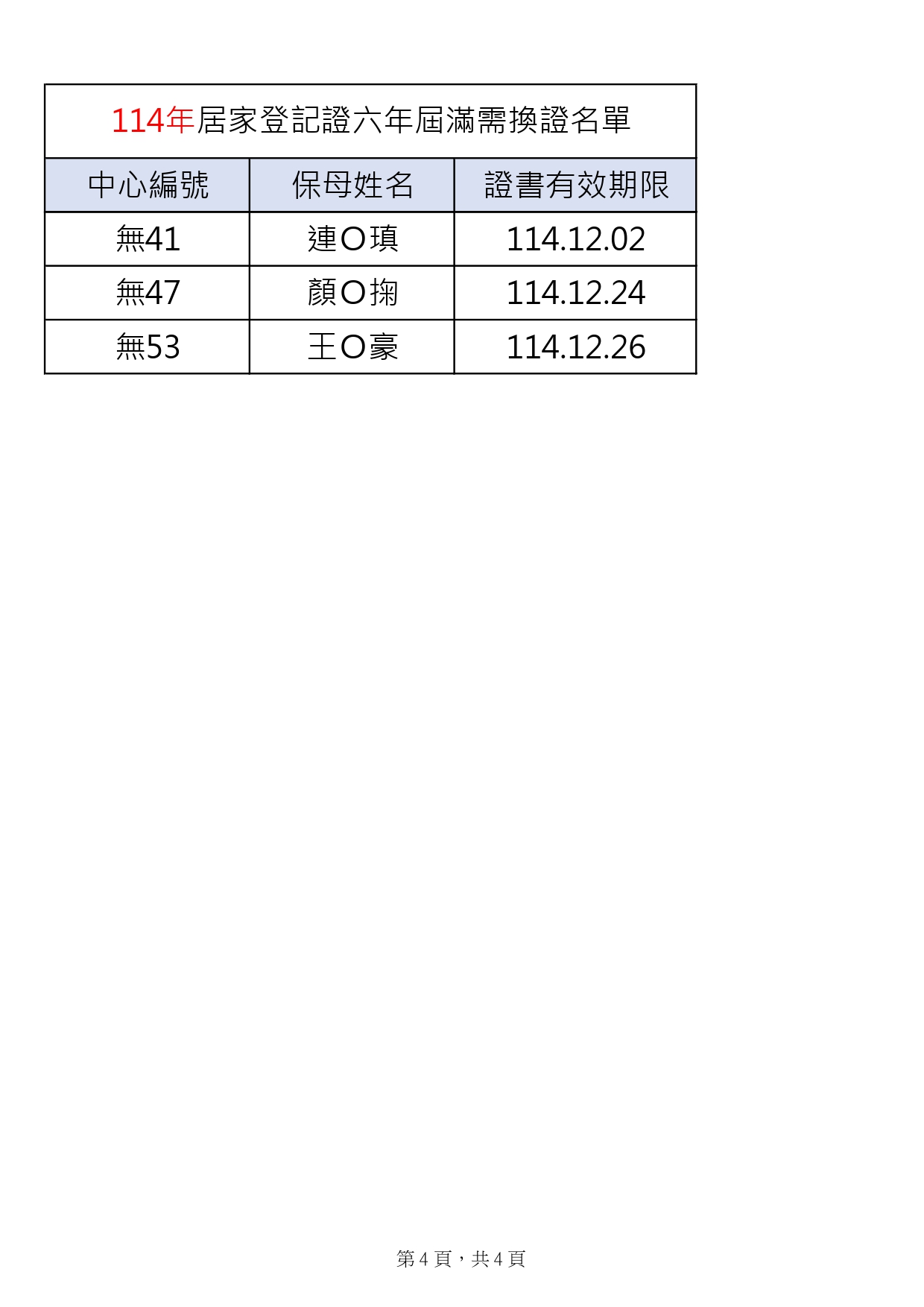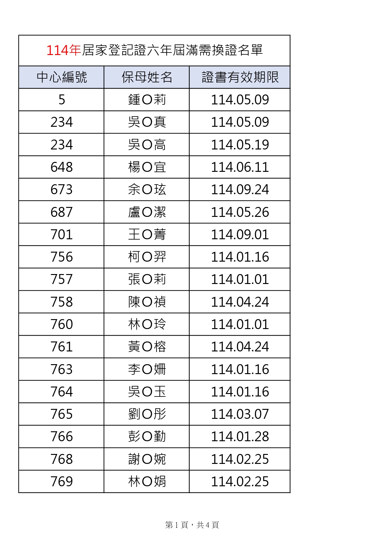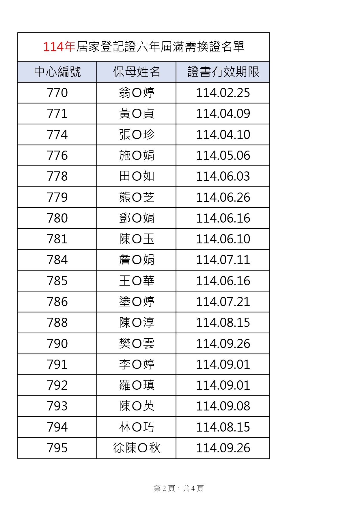 114年度登記證六年屆滿需換證名單如下表(共計4頁),