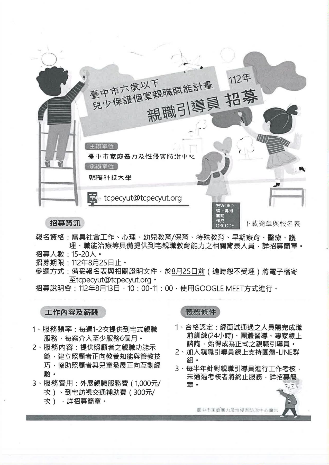 家防中心112年台中市6歲以下兒童少保護親職賦能服務人員招募