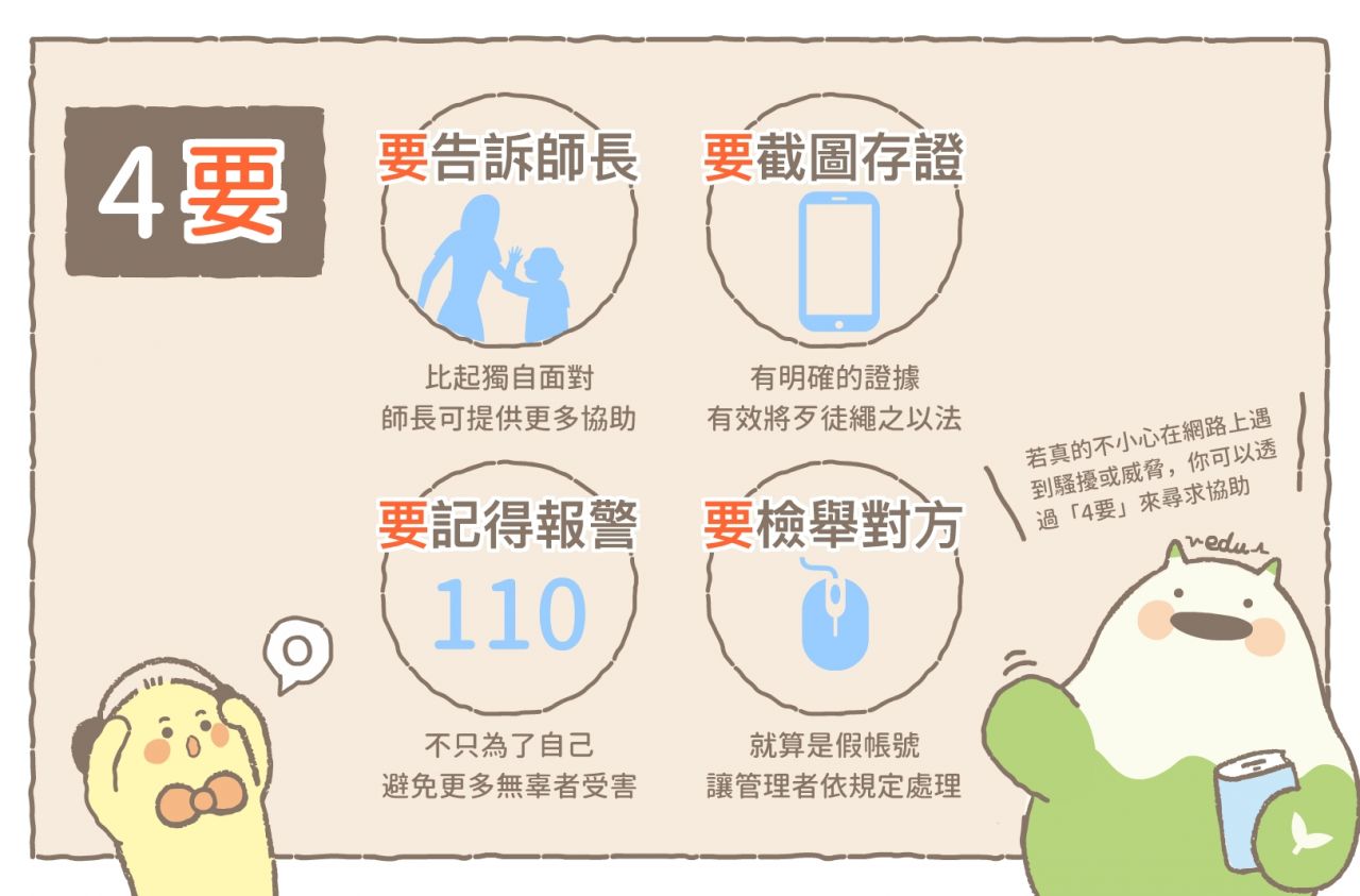 防治數位性別暴力,叮嚀大家,有「五不四要」守則,希望大家一起來避免,類似的事件再發生,以及減少受害者的傷害ヾ(´・ω・`)ノ 。