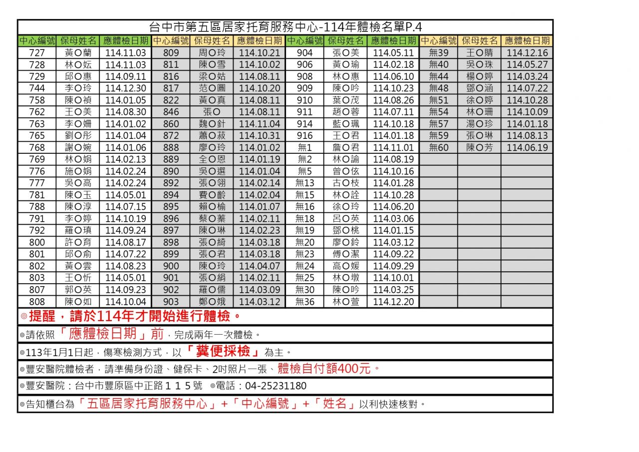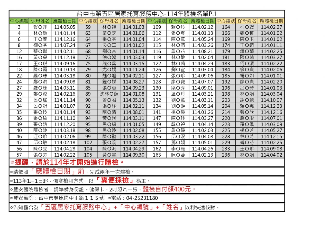 請各位托育人員依個別體檢日到期前完成(詳如下圖名單),