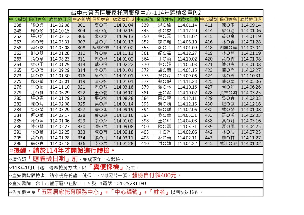 ◎114年托育人員需體檢名單如下: