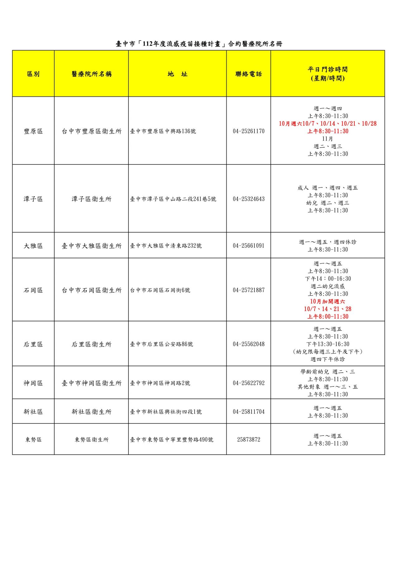 臺中市112年流感疫苗合約醫療院所名冊-已於9月28日更新