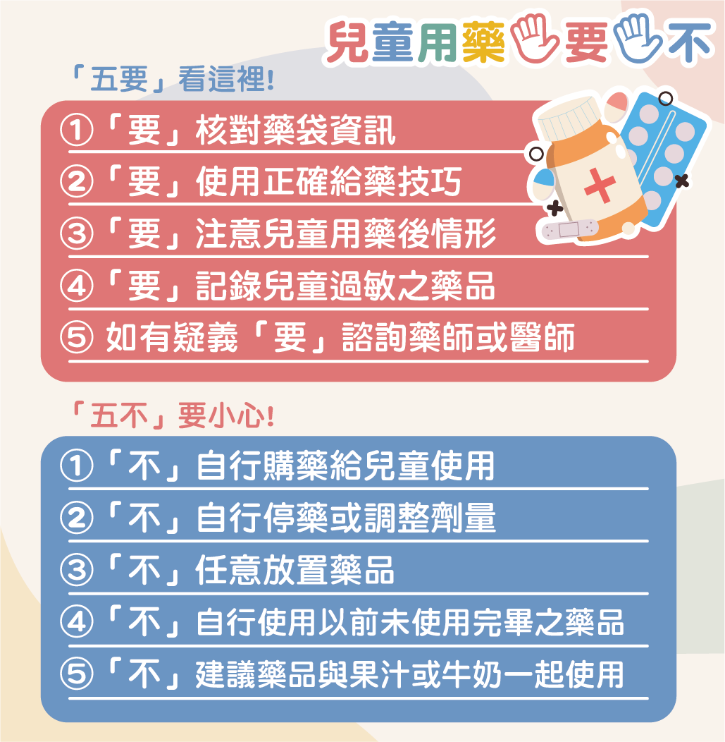 食藥署提醒家長與照護者,因兒童的器官尚未發育成熟,對於藥品的吸收、分佈、代謝、排除都與成人不同,故兒童使用藥品時,應謹記下列「五要五不」: