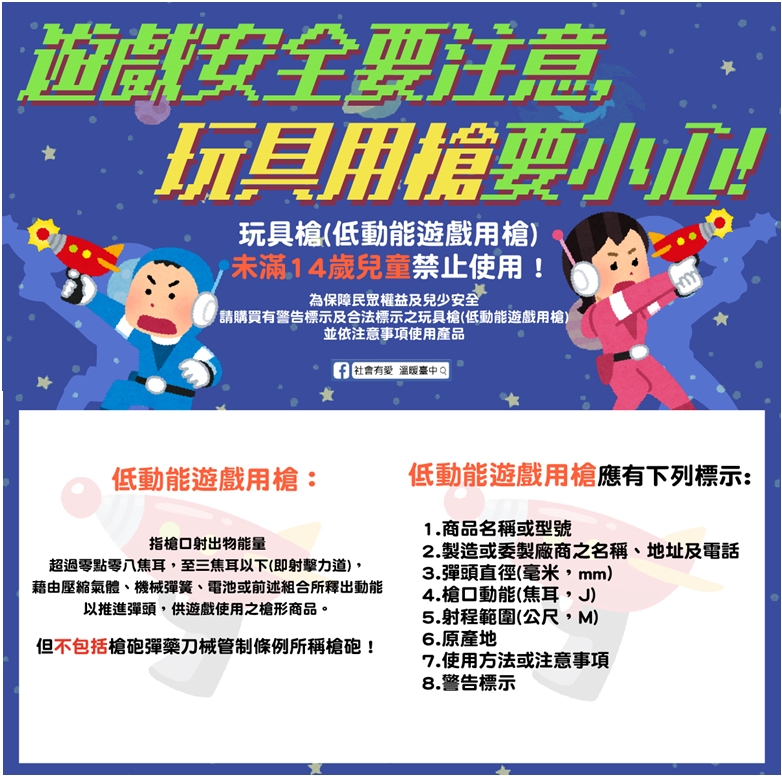 ❷為保障民眾權益及兒少安全,請購買有警告標示及合法標示之遊戲用槍,並依注意事項使用產品!