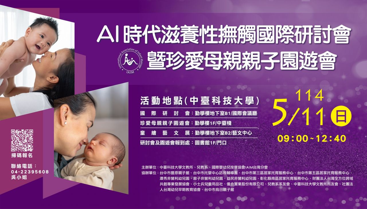 為歡慶母親節,中臺科技大學與國際嬰幼兒按摩協會(IAIM)將於 114/5/11(日) 盛大舉辦:「AI 時代滋養性撫觸」國際研討會&「珍愛母親」親子園遊會