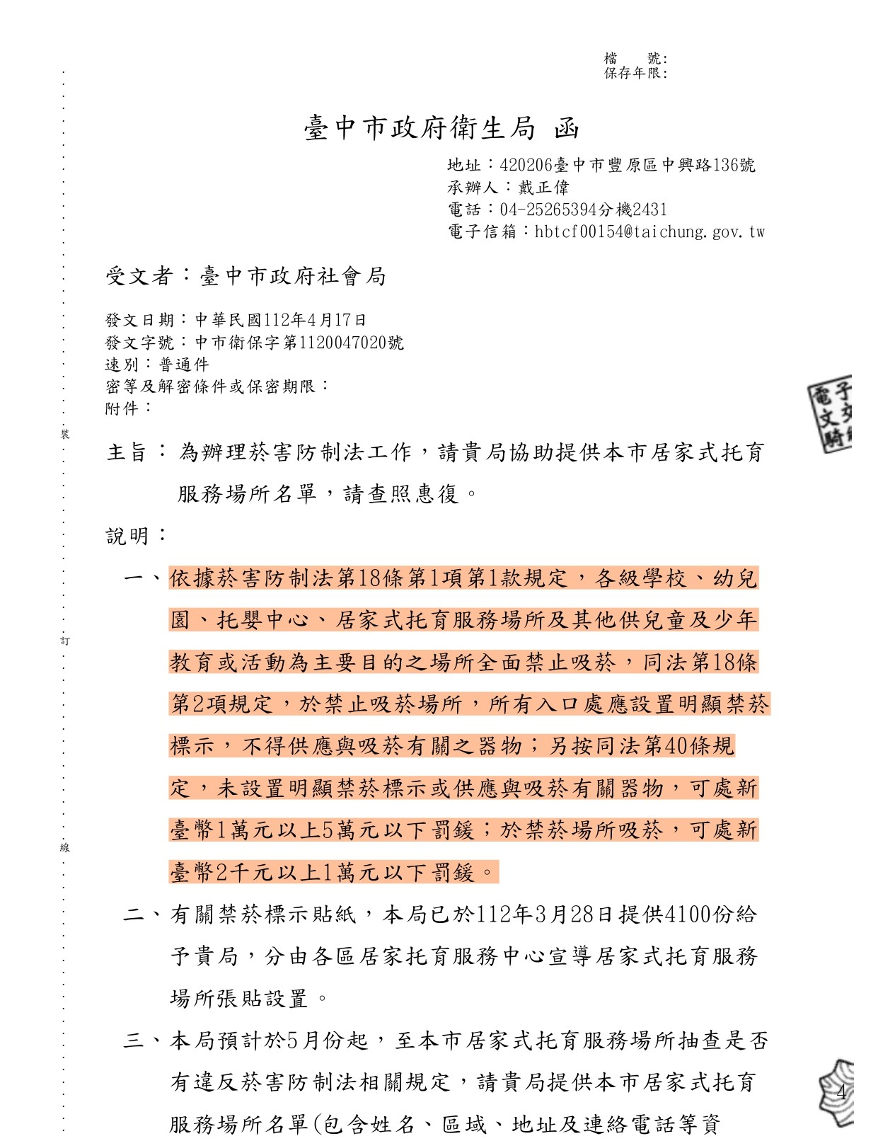 臺中市衛生局不定期抽查禁菸標誌張貼,請托育人員應將