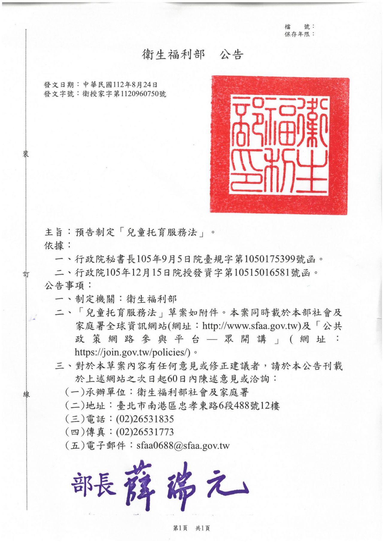 針對公告內容有任何修正建議,於公告次日起60日內向本部社會及家庭署提出(發布於 2023-08-24 截止於 2023-10-23)