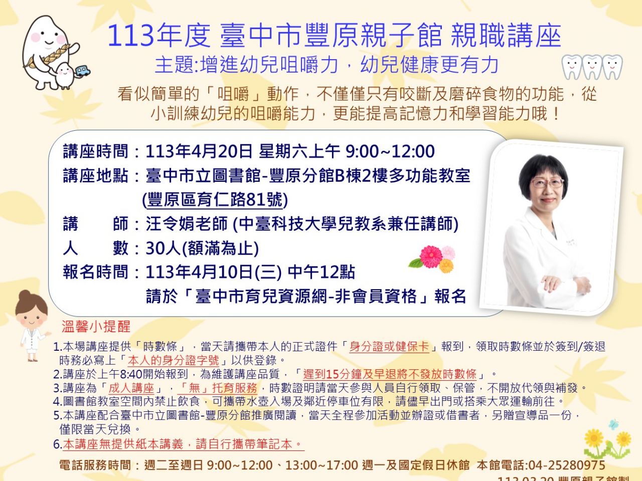 [轉知]豐原親子館-親職講座:增進幼兒咀嚼力,幼兒健康更有力